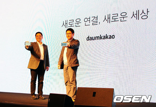 다음카카오 최세훈 이석우 공동 대표가 '다음카카오'의 새로운 CI가 표시 된 모바일 기기를 들고 포즈를 취하고 있다.
