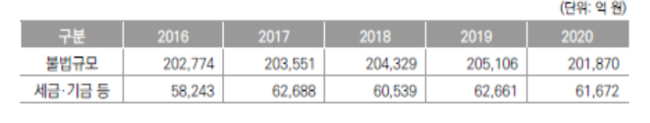 <연도별 불법스포츠도박 추정 규모 및 세금/기금 포탈 추정액>