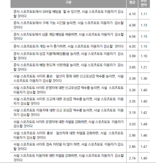 스포츠 베팅 이용자들은 스포츠토토의 모바일 베팅, 구매가능 시간 및 경기 증가, 싱글베팅 허용, 배당률 증가 등의 제도가 개선된다면 불법스포츠도박 이용이 감소할 것으로 인식한 반면, 불법스포츠도박 처벌 강화, 예방 교육 및 캠페인 등은 효과가 낮을 것으로 인식했다. 이는 불법스포츠도박 이용 방지를 위해서는 합법 스포츠토토 상품의 게임성 강화와 관련된 제도 개선이 더 효과가 있는 것을 의미한다.