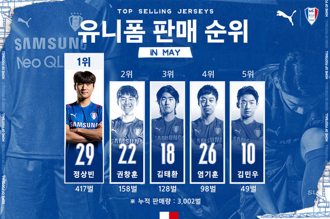 수원 삼성은 1일 '5월 수원의 선수별 유니폼' 판매 순위를 공개했다.