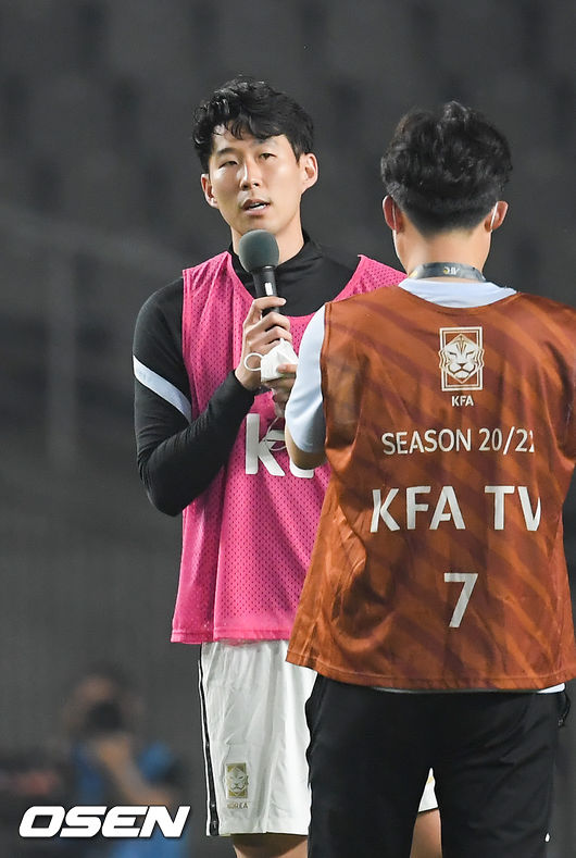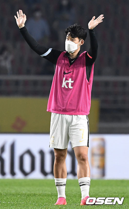경기 후 직접 마이크를 잡은 손흥민은 “가까이서 인사를 못드려 죄송하다. 많은 분들이 경기장에 오셨는데 감사하다는 말씀을 드리고 싶다”고 인사했다. 상황이 좋아져서 꽉 찬 관중들과 만날 날을 빨리 기대한다. 진심으로 많이 응원해주셔서 감사드린다”고 화답했다. 손흥민은 손을 흔들며 팬서비스를 한 뒤 경기장을 빠져나왔다. / jasonseo34@osen.co.kr