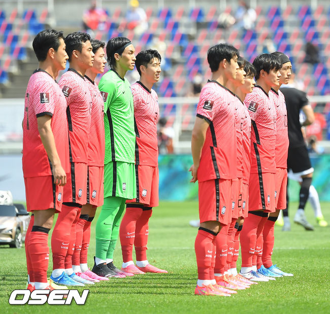 한국은 4-1-3-2 포메이션을 가동했다. 황의조와 손흥민이 투톱 공격수로 출격했고, 2선에 송민규 이재성 권창훈이 자리했다. 원볼란치로 정우영이 구축했다. 포백라인은 홍철 김영권 박지수 김문환이 형성했다. 골문은 김승규가 지켰다. 김민재는 경고 누적으로 빠졌다.