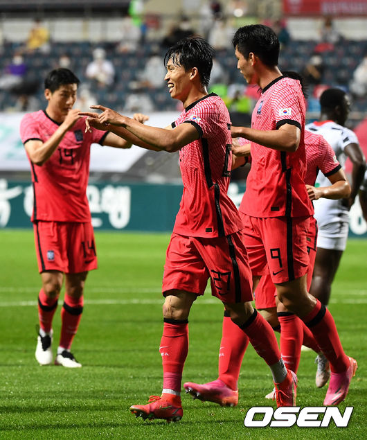 골키퍼 포함 교체 선수 5명이 전부인 가나를 상대로 강한 공격이 이어졌다. 3분 백승호의 프리킥이 골대 위를 흔들었다. 백승호는 5분 중거리 슈팅으로 골키퍼를 깜짝 놀라게 했다. 7분 조영욱의 헤더는 골키퍼 정면으로 향했다.