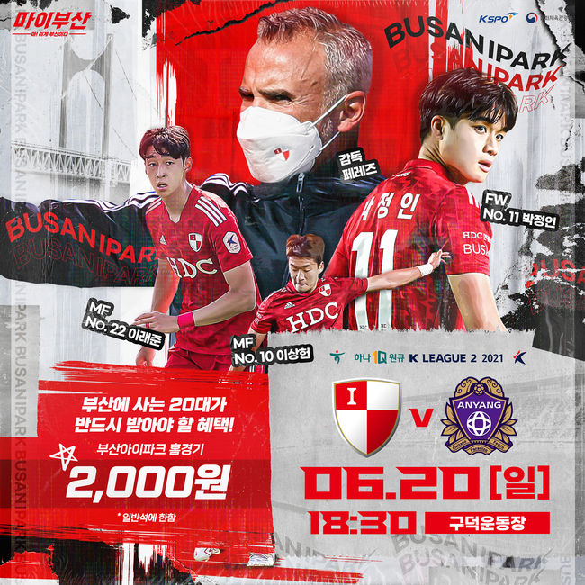 또한 ‘나에게 20대란’을 다섯 글자로 표현하기 온라인 이벤트도 진행한다. 안양전 하프타임 전까지 나에게 20대란 다섯 글자로 표현해 부산아이파크 카카오톡 채널로 보내면 전광판에 노출되며 배달의 민족 30,000원 권을 받을 수 있다. 센스 있고 재미있는 답변을 한 팬 10명은 당첨될 확률이 높다.
