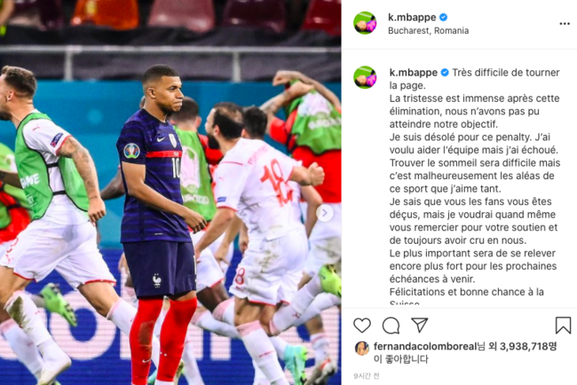 경기 후 음바페는 자신의 SNS에 사과문을 올렸다. 그는 “탈락으로 슬픔에서 한 동안 벗어나지 못할 것이다. 우리는 목표를 이루지 못했다. 실축을 해서 죄송하다. 팀을 돕고 싶었지만 그러지 못했다. 불행하게도 스포츠에는 오르막과 내리막이 있지만 난 그런 점을 사랑한다”고 적었다.