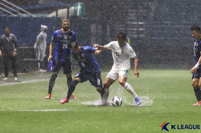 후반 34분 엄청난 폭우로 그라운드 컨디션이 도저히 경기를 할 수 없는 지경에 이르렀다. 심판이 경기를 잠시 중단했다. 다행히 비가 그쳤고 경기는 약 40분 뒤 재개됐다. 울산은 실점 없이 경기를 마쳤다. / jasonseo34@osen.co.kr