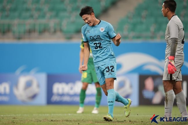 고전 끝에 선취골은 대구가 터트렸다. 전반 45분 하프라인에서 넘어온 롱킥을 조진우가 헤딩으로 넘겨주자 김진혁이 가슴 트래핑으로 잡고 그대로 발리슛을 터트렸다. 대구가 1-0으로 전반전을 앞섰다.