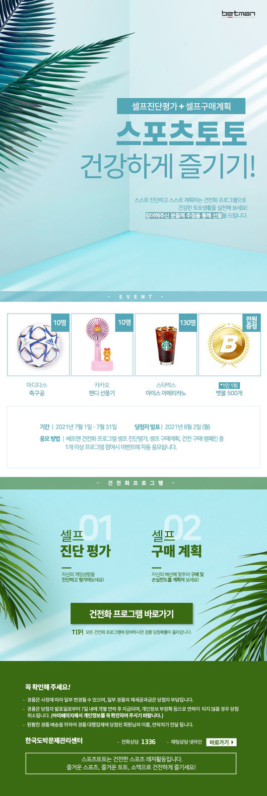 국민체육진흥공단이 발행하는 체육진흥투표권 스포츠토토의 공식 온라인 발매사이트 베트맨(www.betman.co.kr)이 7월 건전화 이벤트인 ‘스포츠토토 건강하게 즐기기!’를 1일(목)부터 31일(토)까지 한 달간 실시한다.