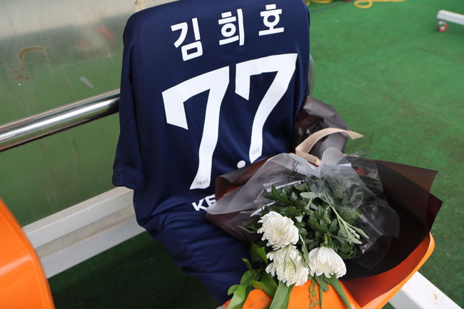선수단이 모두 근조 리본을 달고 경기에 임한다. 또 구단 프런트도 근조 리본을 달고 경기장을 찾았다. 또 벤치에는 고 김희호 코치의 이름이 새겨진 유니폼과 함께 꽃다발이 놓였다.