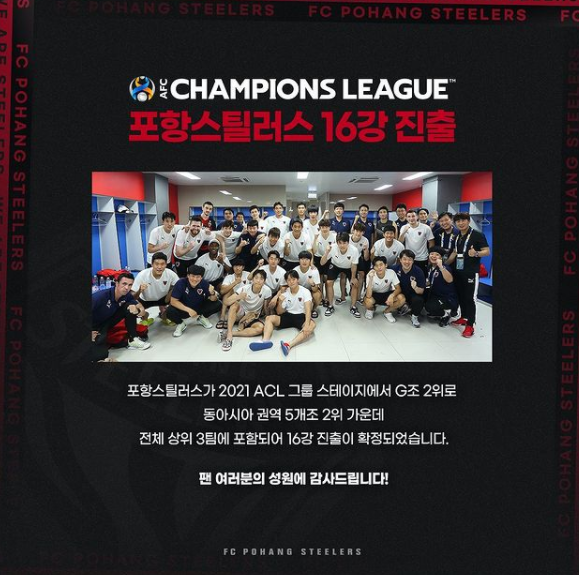 이번 대회 16강 진출권은 각 조 1위 5개 팀과 5개 조 2위 중 성적이 좋은 상위 3개 팀에게 돌아가기 때문. J조 2위 킷치(홍콩)에 득실차에서 앞서 있던 포항은 감바가 승점 9점(2승3무1패)에 그치며 5개 조 2위 가운데 최소 3위 이상을 확정했다.
