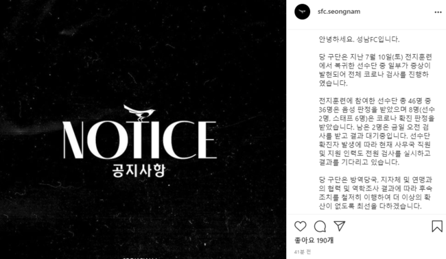 성남은 "선수단의 나머지 2명도 오전 검사를 받아서 결과를 기다리는 중이다. 구단 내 확진자 발생으로 인해 사무국 직원 및 지원 인력 전원도 코로나 검사를 받았다"고 설명했다.