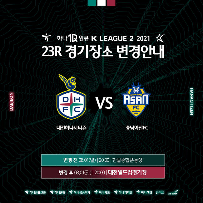 대전은 기존 홈경기장이었던 대전월드컵경기장의 잔디 교체 공사로 인해 8월 이후 홈경기(6경기)를 한밭종합운동장에서 개최할 예정이었으나, 공사 기간이 일부 변경됨에 따라 8월 1일 일요일 오후 8시에 열리는 충남아산 FC와의 ‘하나원큐 K리그2 2021’ 23라운드 경기까지 대전월드컵경기장에서 치르고, 8월 21일 토요일 오후 8시에 펼쳐지는 경남FC와의 ‘하나원큐 K리그2 2021’ 26라운드 홈경기를 포함한 잔여 5경기를 한밭종합운동장에서 치른다.