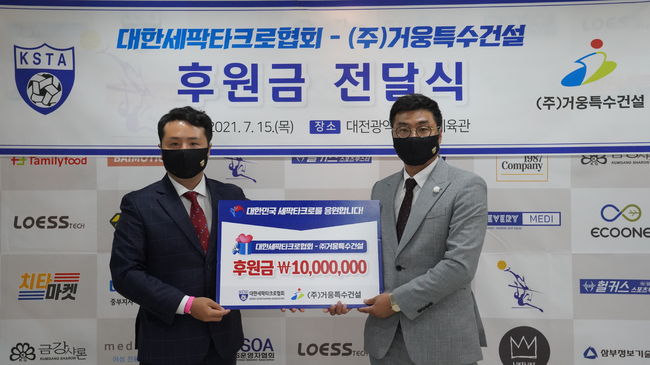대한세팍타크로협회(회장 오주영)와 ㈜거웅특수건설(대표 양정수)의 후원금 일천만원 전달식을 15일 2021 시·도 대항 세팍타크로대회’가 열리는 대전광역시 충무체육관에서 가졌다.
