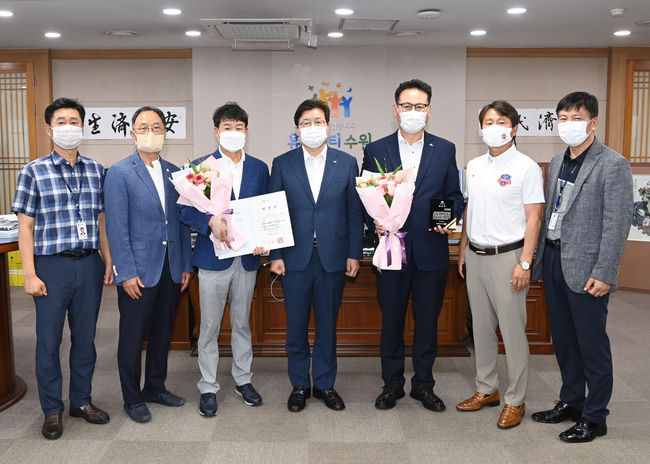 염태영 수원시장은 28일 김병두 신임 이사장에게 임명장을 수여했다. 더불어 명문 구단으로 도약 및 발전을 위해 투철한 사명감으로 헌신한 수원FC 김춘호 전임 이사장에게도 공로패를 수여했다.