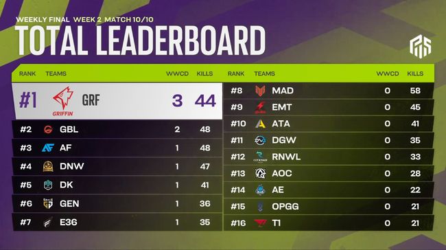 그리핀은 18분 경 큰 위기에 빠졌다. T1을 가까스로 잡았지만 기블리가 전장을 덮쳤다. 그리핀은 기블리를 그로기 상태로 만들고 쓰러졌으나, 뒤따라온 매드 클랜이 기블리를 마무리하면서 2주차 우승을 확정했다. 우승팀이 정해진 상황에서 치킨을 뜯은 팀은 담원이었다. 마지막까지 힘을 낸 담원은 5라운드 치킨으로 3주차 ‘위클리 서바이벌’ 직행에 성공했다.