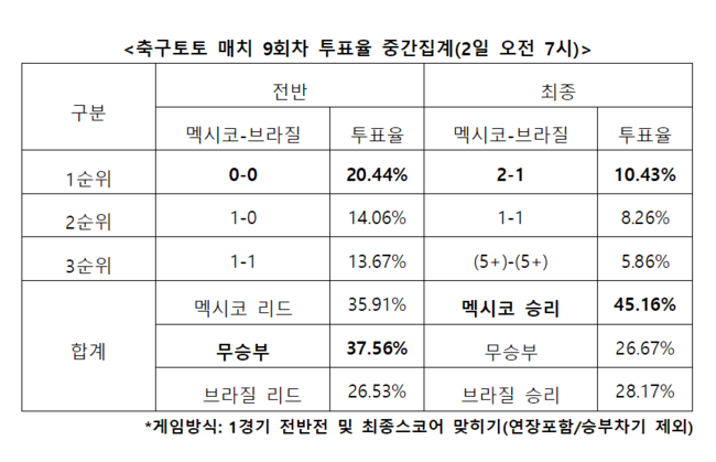 국민체육진흥공단이 발행하는 체육진흥투표권 스포츠토토의 수탁사업자 스포츠토토코리아가 오는 3일(화) 오후 5시에 가시마(일본)에서 펼쳐지는 국제대회 4강전을 대상으로 한 축구토토 매치 9회차 투표율을 중간 집계한 결과, 45.16%의 축구팬이 멕시코의 승리를 예상했다고 전했다.