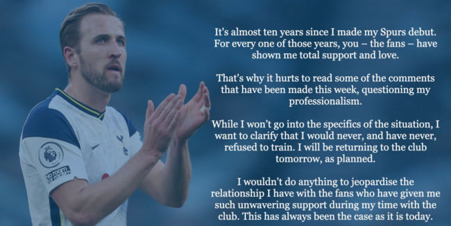 그러자 케인은 사과문을 통해 팬들에게 다가섰다. 그는 SNS를 통해 "토트넘에 뛴 지 10년이 다 되어간다. 그 기간 동안 팬들은 나를 전폭적으로 지지했다"라고 입을 열었다.