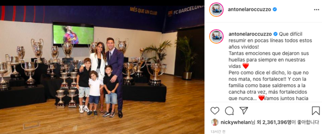 메시는 아내 안토넬라 로쿠조 및 자녀들과 함께 바르셀로나 홈구장에서 자신이 따낸 우승트로피를 배경으로 기념사진을 찍었다. 메시의 아내는 자신의 SNS에 “바르셀로나에서 보낸 오랜 세월을 몇줄로 요약하기 힘들다. 어디를 가든 항상 앞으로 나아가자”는 메시지를 올렸다.