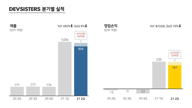 11일 데브시스터즈는 K-IFRS 연결 기준 2021년 2분기 및 상반기 잠정 실적을 발표했다. 데브시스터즈는 2021년 2분기 매출액으로 지난해 동기 대비 460% 증가한 958억 원을 기록했다. 영업이익과 당기순이익은 각각 197억 원, 160억 원으로 나타났다. 영업이익, 당기순이익 모두 흑자전환에 성공했다.
