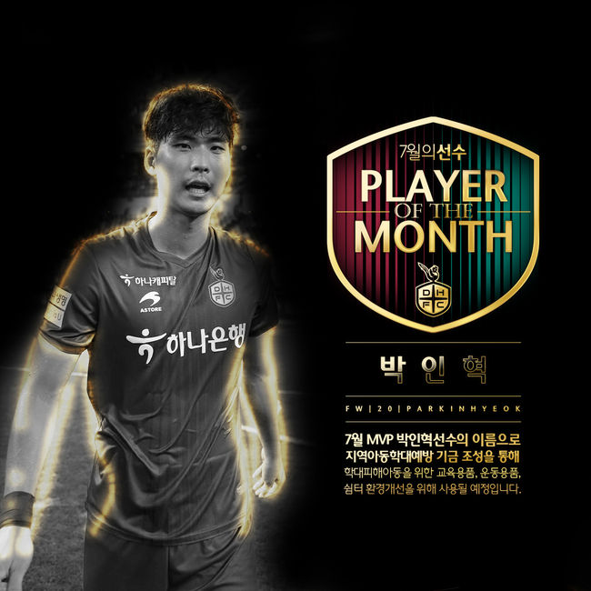 월간 MVP 투표는 매월 대전하나시티즌 공식 홈페이지를 통해 진행되며 팬 투표 참여자 중 추첨을 통해 수상 선수의 애장품을 선물하고 있다. 또한 매월 월간 MVP로 선정된 선수의 이름으로 아동학대예방 기금 조성을 통해 ‘아이들이 행복한 대전 만들기’를 위해 앞장서고 있다. /10bird@osen.co.kr