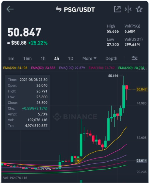 PSG 구단은 ‘$PSG 팬토큰’이라는 자체 암호화 화폐를 발행해 자산 일부로 운용하고 있다. 그런데 팬토큰은 메시의 PSG 입단이 확정된 후 가치가 두 배 이상 폭등한 것으로 알려졌다. 메시 영입에 대한 기대감으로 매수자가 폭발적으로 몰렸기 때문이다.