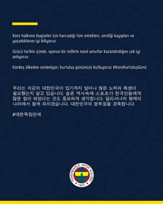 페네르바체는 15일(한국시각) 공식 SNS를 통해 8월 15일 대한민국의 제76주년 광복절을 축하했다.