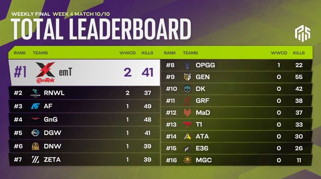 이번 4주차에선 무려 8팀이 치킨 맛을 보는 등 치열한 경쟁이 펼쳐졌다. 1~3주차처럼 독식하는 팀이 없었다. 1일차까지 1위를 질주한 팀은 아프리카다. 37킬을 기록하면서 치킨과 함께 ‘킬 경쟁’에서도 앞서나갔다. 이번 대회에 적용된 ‘치킨 룰’은 치킨 수가 같으면 다수의 킬을 확보한 팀이 우위를 점하는 구조다.