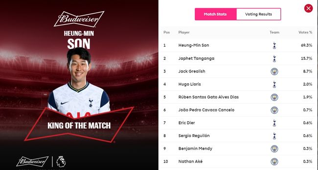 손흥민이 이날 경기의 KOTM(King of the match)로 선정됐다. 프리미어리그 공식 홈페이지의 온라인 투표로 결정되는 KOTM에서 손흥민은 69.3%의 지지를 받았다. 2위는 15.7%의 탕강가였다. 또 1억 파운드(1613억 원)의 이적료로 맨시티에 합류한 잭 그릴리쉬는 8.7%로 3위였다. /10bird@osen.co.kr