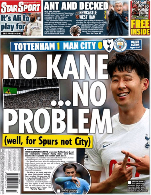 ‘데일리 스타’는 스포츠면 1면에서 ‘No Kane No problme’(케인 없어도 문제 없다)의 제목과 함께 손흥민의 골세리머니 사진을 실었다. 이 매체는 “물론 토트넘에게 하는 말이다. 맨시티에게는 아니다”라고 덧붙이며 맨시티행을 원하는 케인을 비꼬았다.