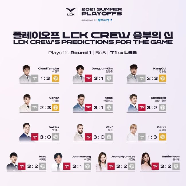 라이엇 게임즈는 T1-리브 샌드박스의 경기를 앞두고 공식 SNS에 관계자들의 결과 예측인 ‘승부의 신’을 공개했다. 관계자들은 김동준, 이현우 해설을 포함한 국내-해외 해설진, 분석데스크, 옵저버 등 총 13명으로 구성돼있다.