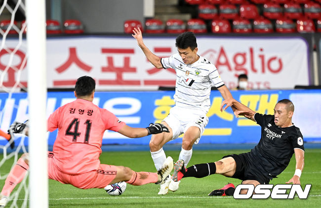 송민규는 전반 4분 위협적인 오른발 감아차기를 하면서 포문을 열었다. 이어진 전반 6분 코너킥에서 김보경이 올린 공을 구자룡이 헤더로 연결했다. 김영광이 가까스로 펀칭했다.