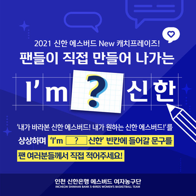 지난 두 시즌 에스버드의 캐치프레이즈로 사용한 I’m 신한, We are S-birds를 연속하는 의미로 I’m ( ) 신한의 빈칸을 에스버드 농구단을 사랑해주시는 분들의 의견으로 채울 예정이다. 글자수나 형식에 제한 없이 에스버드를 표현할 수 있는 문구면자유롭게 참여 가능하다.