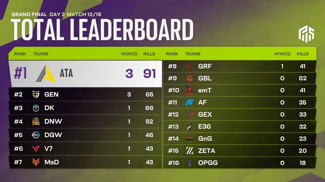 극적으로 그랜드 파이널에 합류한 ATA가 압도적인 경기력을 선보이면서 순항하고 있다. 젠지의 거센 추격을 뿌리치면서 3치킨, 91킬로 1위 굳히기에 돌입했다.