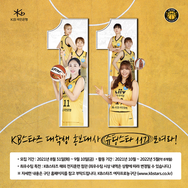 충청권 소재 대학생을 대상으로 진행되는 ‘슈팅스타 11기’ 모집에 대한 자세한 내용은 KB스타즈 여자프로농구단 홈페이지와 공식 SNS 계정을 통해 확인할 수 있다.
