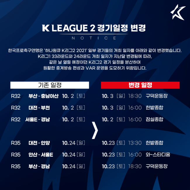 K리그1 33라운드와 24라운드 개최 일자가 지난달 변경됨에 따라, 같은 날 열릴 예정이던 K리그2 경기 일정을 분산하여 원활한 중계방송 편성과 VAR 운영을 도모하기 위함이다.
