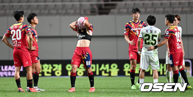 박진섭 감독은 확성기를 통해 팬들에게 “감독독으로서 죄송하다. 모든 책임은 제가 진다. 죄송하다. 할 말이 없다”라며 “선수들은 강등을 당하지 않기 위해 열심히 하고 있고 뭐든지 다 하고 있다"라고 입을 열었다.