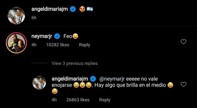 친구의 악플 본 디 마리아도 바로 반격에 나섰다. 그는 "웃기시네, 나는 코파 아메리카 우승했는데, 넌 뭐했냐"라고 네이마르에 답변을 달았다.