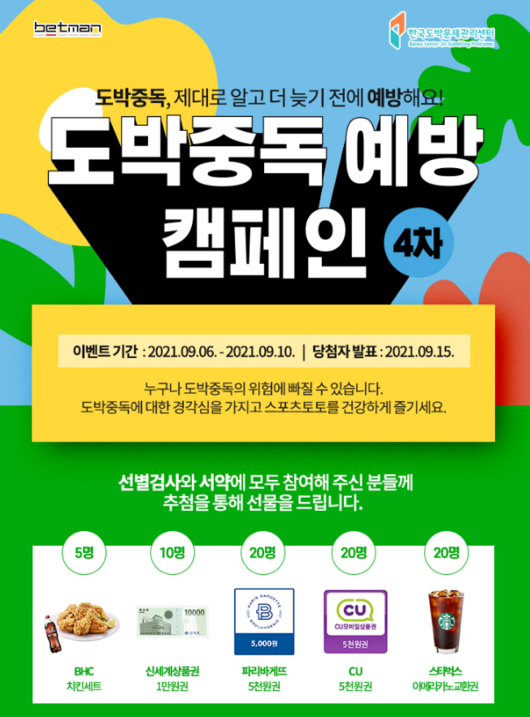 국민체육진흥공단이 발행하는 체육진흥투표권 스포츠토토의 수탁사업자 스포츠토토코리아가 온라인 공식 발매사이트 베트맨(www.betman.co.kr)을 통해 이번 달 6일(월)부터 10일(금)까지 2021년 4차 ‘온라인 도박중독 예방 캠페인’을 실시한다고 밝혔다.