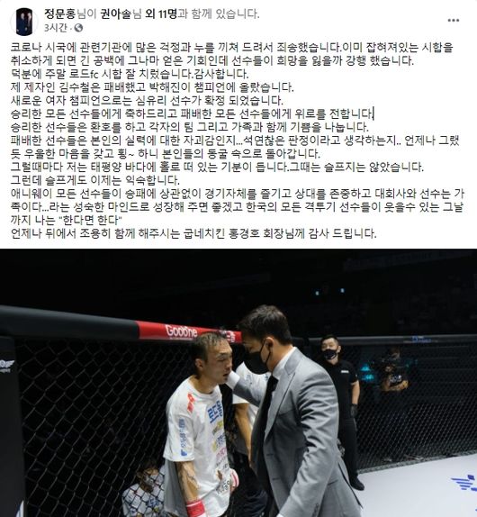 그러면서 대한민국 모든 격투기 선수들이 잘되기를 바랐다. “모든 선수들이 승패에 상관없이 경기 자체를 즐기고 상대를 존중하고 ‘대회사와 선수는 가족이다’라는 성숙한 마인드로 성장해 주면 좋겠고, 한국의 모든 격투기 선수들이 웃을 수 있는 그 날까지 나는 ‘한다면 한다’ 언제나 뒤에서 조용히 함께 해주시는 굽네치킨 홍경호 회장님께 감사드립니다”. /10bird@osen.co.kr