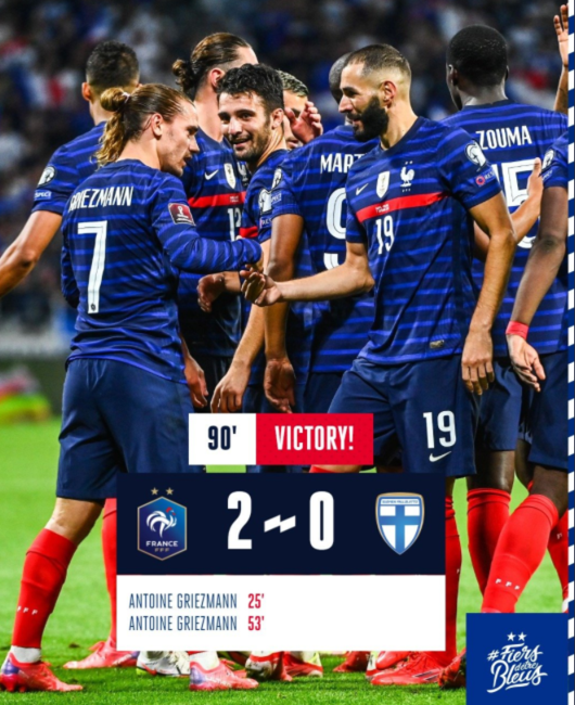 프랑스는 8일(한국시간) 프랑스 데신샤르피외 파르크 올랭피크 리오네에서 열린 2022 카타르 월드컵 유럽 지역 예선 D조 6번째 핀란드와 경기에서 그리즈만의 멀티골을 앞세워 2-0 승리를 거뒀다.