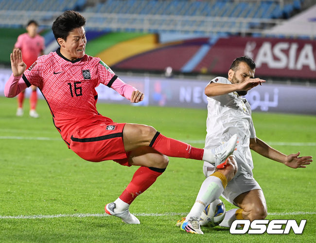 4-2-3-1의 한국은 황의조가 최전방에 서고 황희찬, 손흥민, 송민규가 2선에 섰다. 정우영, 황인범이 미드필드에 포진했다. 홍철, 김민재, 김영권, 이용의 포백에 골키퍼는 김승규였다.