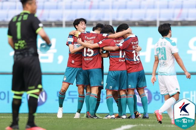 대전하나시티즌은 10일 대전 한밭종합운동장에서 개최된 ‘하나원큐 K리그2 2021 33라운드’에서 마사의 멀티골이 터져 안산 그리너스FC를 4-1로 이겼다. 승점 52점의 3위 대전은 3경기 무승을 끊으며 준플레이오프 진출을 확정지었다.