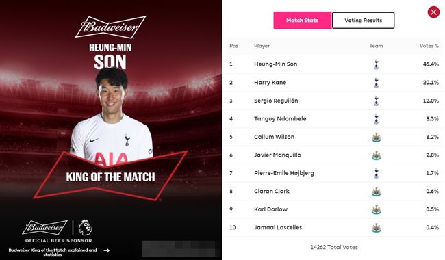 손흥민은 경기 후 프리미어리그 사무국이 선정한 킹오브더매치(KOTM)에 이름을 올렸다. 손흥민은 1만 4000명이 넘게 참여한 팬투표에서 45.4%의 표를 얻어 가장 많은 표를 획득했다.