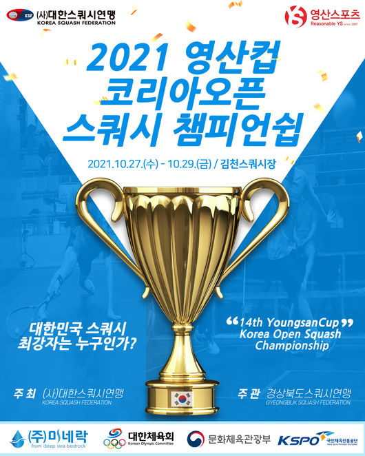 (사)대한스쿼시연맹(회장 허태숙, 이하 연맹)이 주최하고 영산인터네셔널(이승영·전영민 공동대표)이 타이틀 스폰서 참여하는 제14회 영산컵 코리아오픈 스쿼시 챔피언십(이하 대회)이 10월 27일~10월 29일까지 3일간 경상북도 김천시에 위치한 김천스쿼시장에서 개최된다.