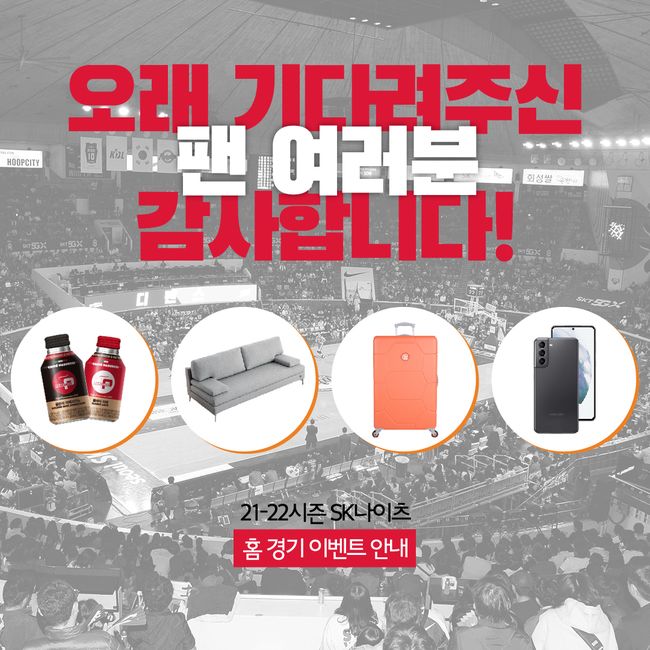 경기중에는 KBL 앱과 SK나이츠 앱을 이용한 깜짝 이벤트를 통해 봄소와 소파, 수잇수잇 대형 캐리어, 삼성 휴대폰 등 다양한 경품을 선물로 증정한다.