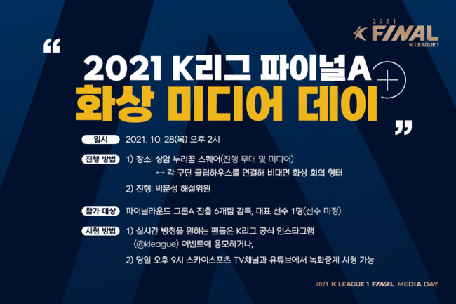 이번 미디어데이는 코로나19 방역지침 준수와 10월 27일 FA컵 4강전 등 경기일정을 고려해 온라인 화상회의 방식으로 진행된다. 서울 마포구 누리꿈스퀘어에 있는 특설 스튜디오에 박문성 해설위원과 K리그 취재기자들이 자리하여 각 팀 클럽하우스에 있는 감독, 선수들과 질의응답을 진행한다.