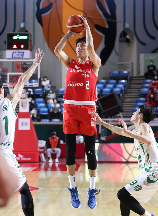 SK는 24일 서울 잠실학생체육관에서 열린 2021-2022 KGC인삼공사 정관장 프로농구 정규리그 원주 DB와 홈 경기에서 95-68로 대승을 거뒀다.