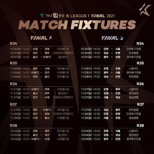 하나원큐 K리그1 2021 파이널 라운드의 일정과 대진이 확정됐다. 10월 30일, 31일 열리는 34라운드부터 12월 4일, 5일 열리는 38라운드 최종전까지 각 팀별로 5경기씩 치르게 된다. '파이널A'에 진출한 6개 팀은 우승과 AFC챔피언스리그 출전권 획득을 위한 경쟁을, '파이널B'에 속한 6개팀은 K리그1 잔류를 위한 경쟁을 벌이게 된다.