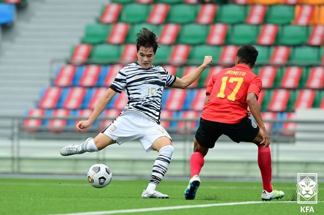 황선홍 감독이 이끄는 대한민국 U23 대표팀은 28일(한국시간) 싱가포르 잘란브사르 스타디움에서 개최된 ‘2021 아시아축구연맹 U23 아시안컵 H조 예선 2차전’에서 박정인의 해트트릭에 힘입어 동티모르를 6-0으로 완파했다. 한국은 필리핀전 3-0 승리에 이어 2연승을 달렸다.