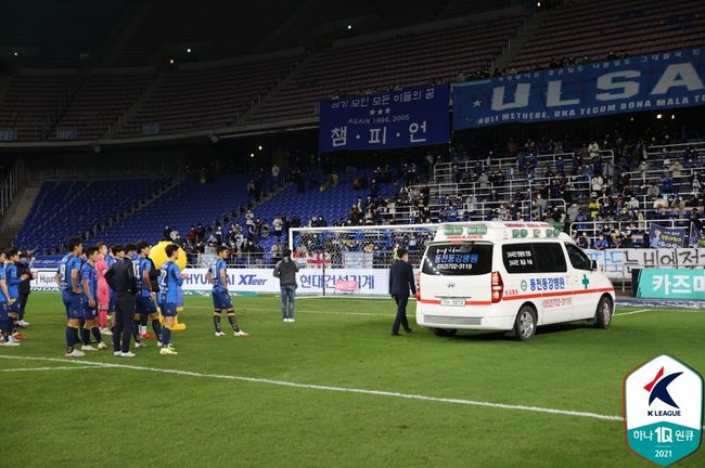 그 결과 경기장 내에서 대기하던 의료진과 구급차가 곧바로 S석으로 향했다. 울산대병원과 중앙병원 구조사 등이 빠르게 응급처치를 했다. 이후 약 10분 거리의 병원 응급실로 이동했다.